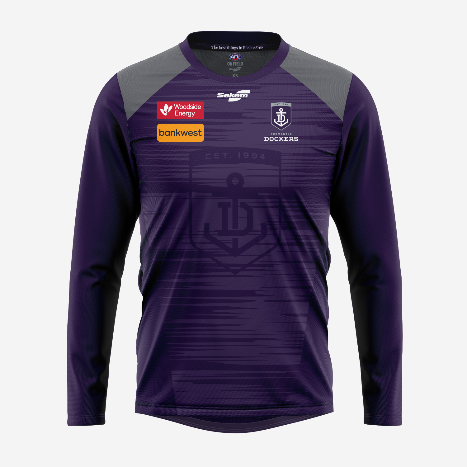 The Official Fremantle Player Training Tee Long Sleeve is the same performance top worn by the players during their training sessions, offering fans an authentic piece of the team’s preparation gear. Crafted from premium Eco-Lite fabric and made with 100% recycled polyester, it provides an environmentally conscious choice without compromising on comfort or durability. The advanced moisture-wicking technology efficiently draws sweat away from the skin, helping you stay cool, dry, and comfortable during high-intensity training or everyday activity. With its lightweight feel, breathable design, and added long-sleeve coverage for extra warmth and protection, this training tee is perfect for cooler conditions, outdoor workouts, or showing your Fremantle pride year-round. Made by Sekem.